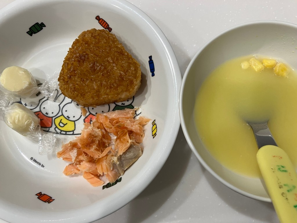 冷凍の焼きおにぎりにキャンディチーズ、夜ご飯の残りの鮭とコーンスープです