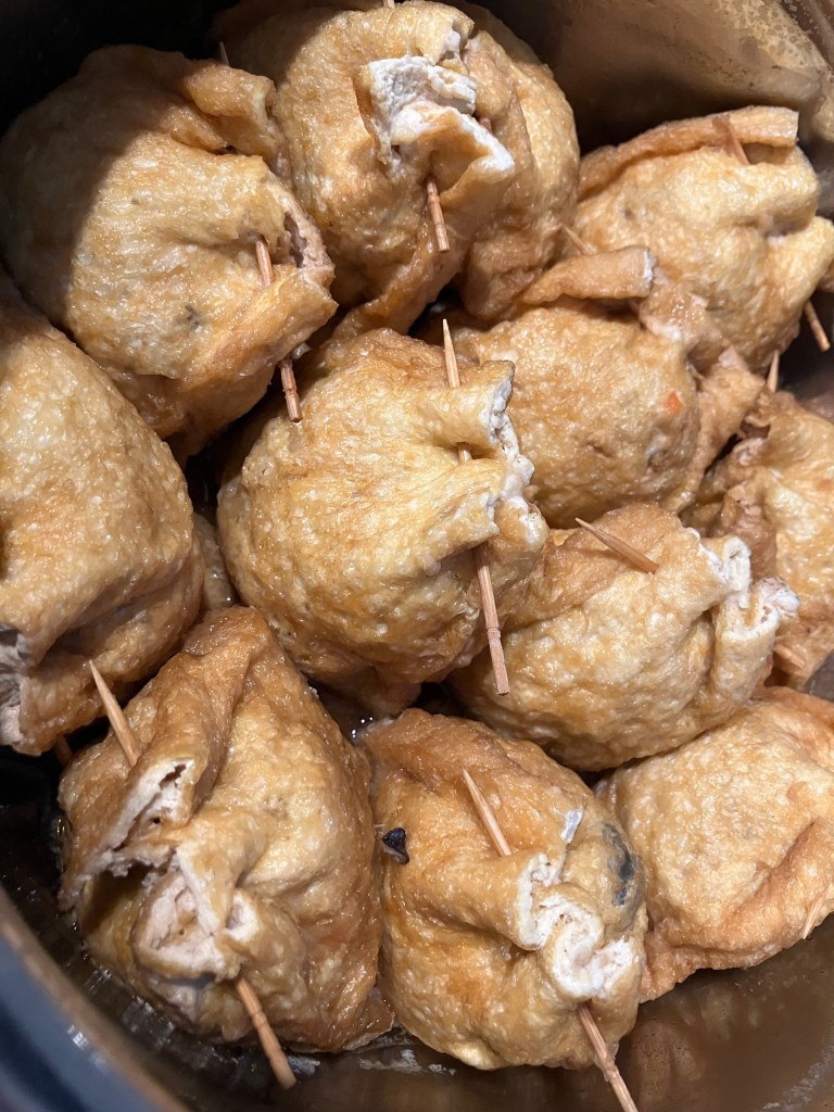 こちらは油揚げの中に刻んだ野菜と鶏ひき肉を混ぜたものを入れております🙂